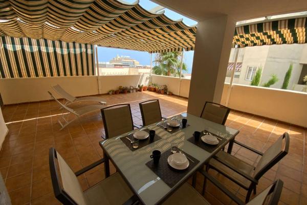 LA VIVIENDA CUENTA CON 2 DORMITORIOS UNO CON CAMA DE MATRIMONIO Y EL OTRO CON 2 CAMAS , 2 BAÑOS , SALONCOMEDOR , COCINA INDEPENDIENTE EQUIPADA , TERRAZA DE 40M2 CON TUMBONAS Y MESA DE COMEDOR Y ESTUPENDASVISTAS AL MAR