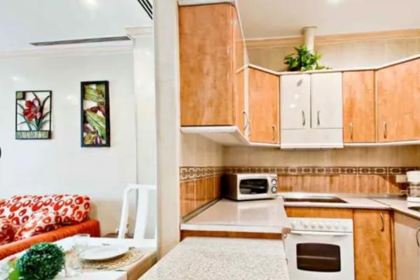 La vivienda consta de salón con sofá , TV , cocina americana completamente equipada con horno, microondas, cafetera, lavadora/secadora