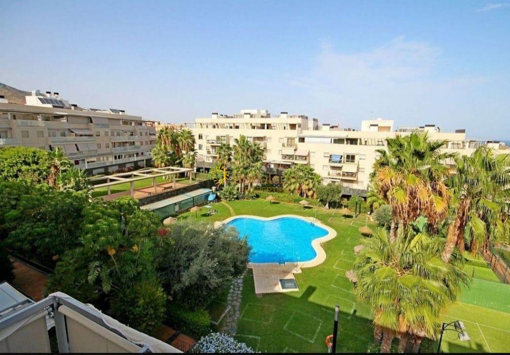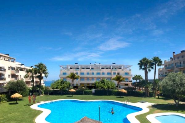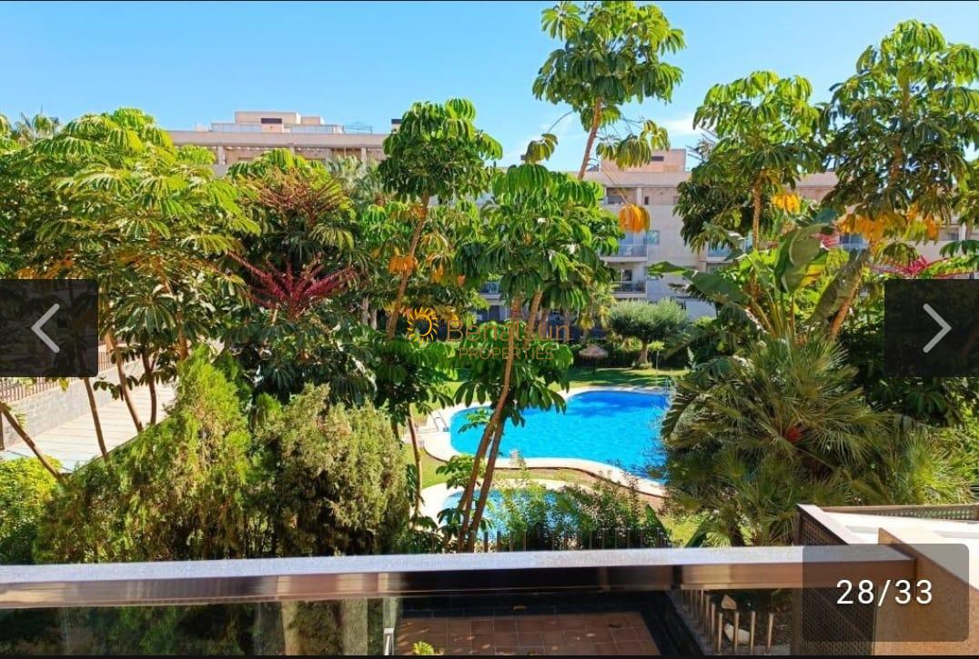 La vivienda consta de salón/comedor con amplio sofá, TV, 2 dormitorios, cocina independiente completamente equipada con frigorífico, horno, lavadora, campana, microondas. Amueblado. Calefacción centralizada. Terraza super acogedora con vistas amplias laterales al mar, a la piscina, jardines y recinto. Muy luminosa. Plaza de garage incluido en el precio.